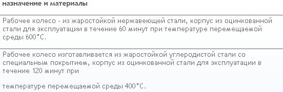 Вентилятор дымоудаления центробежный этого типа в продолжение двух часов способен перемещать газовоздушные смеси продуктов горения температурой до 400 градусов или в продолжение одного часа – до 600 градусов. Использование вентилятора будет максимально эффективным, если эти смеси не будут содержать агрессивных, взрывоопасных, липких, волокнистых компонентов, которые могут причинить вред изоляции, металлу и электродвигателю оборудования.