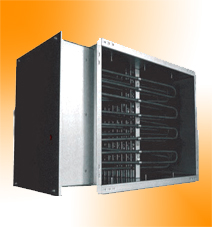 Электрический канальный нагреватель для прямоугольных каналов, корпус и коммутационная коробка изготовлены из оцинкованного стального листа, нагревательные элементы из нержавеющей стали.